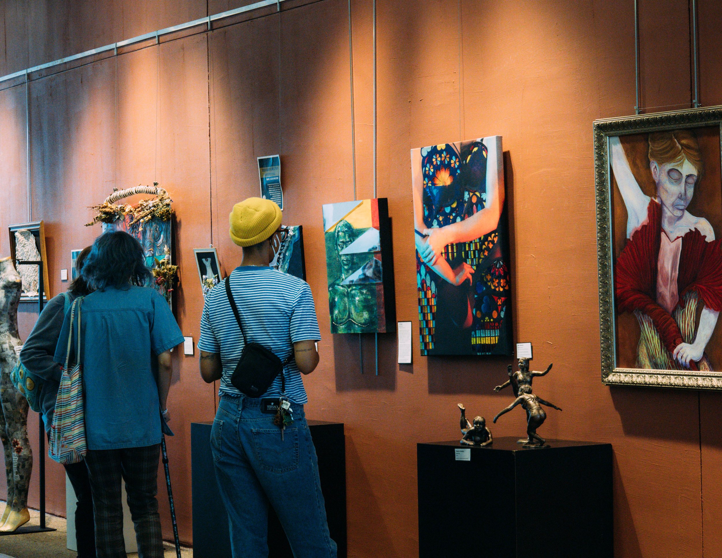 Three people stand looking at a wall filled with visual art from the 2025 Queer Spectra Arts Festival