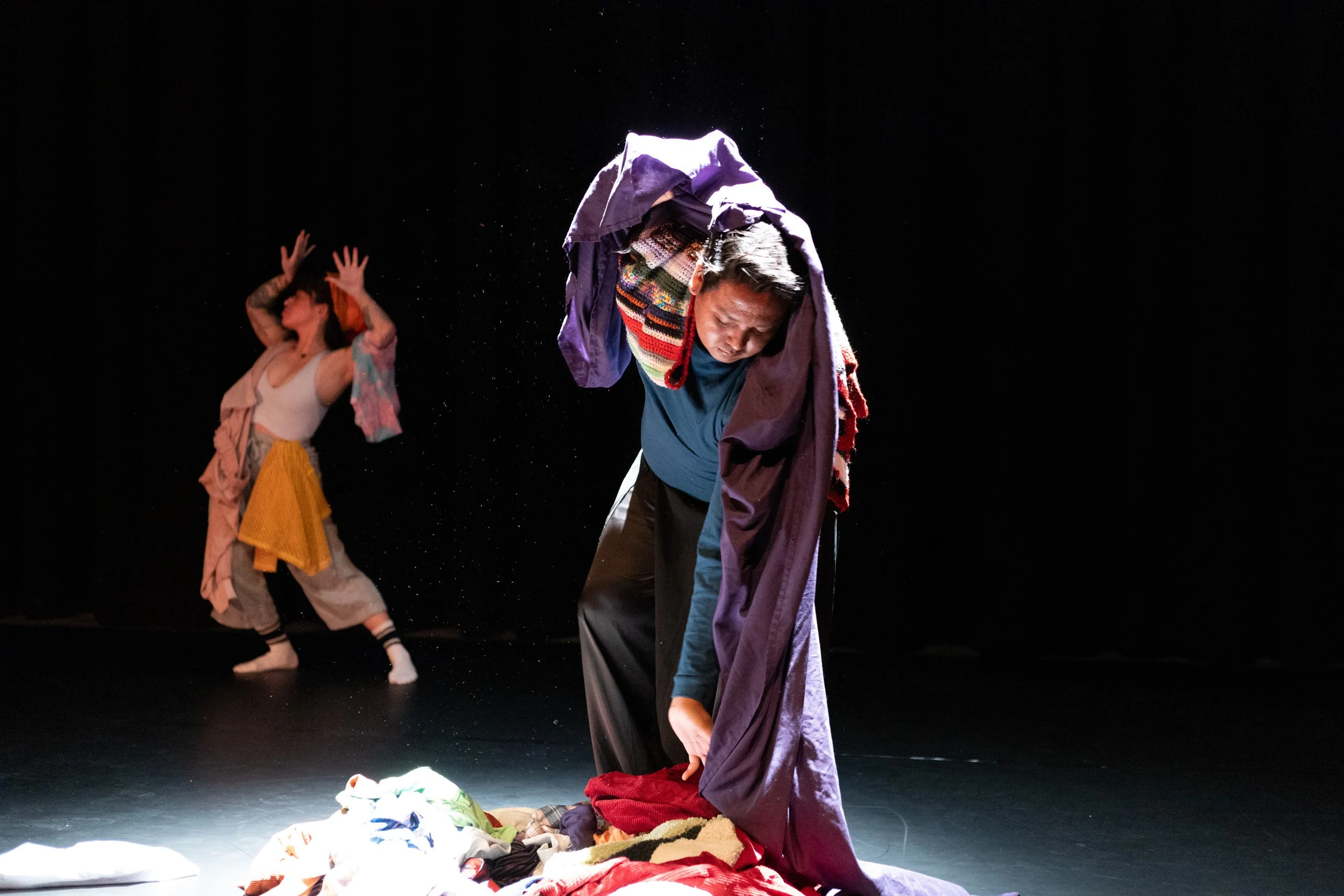 Two performers dancing, covered in fabric, in a Black Box theater at the 2024 Queer Spectra Arts Festival.